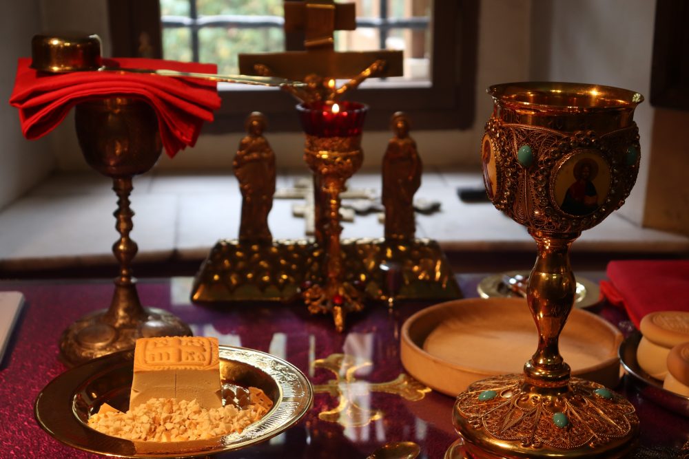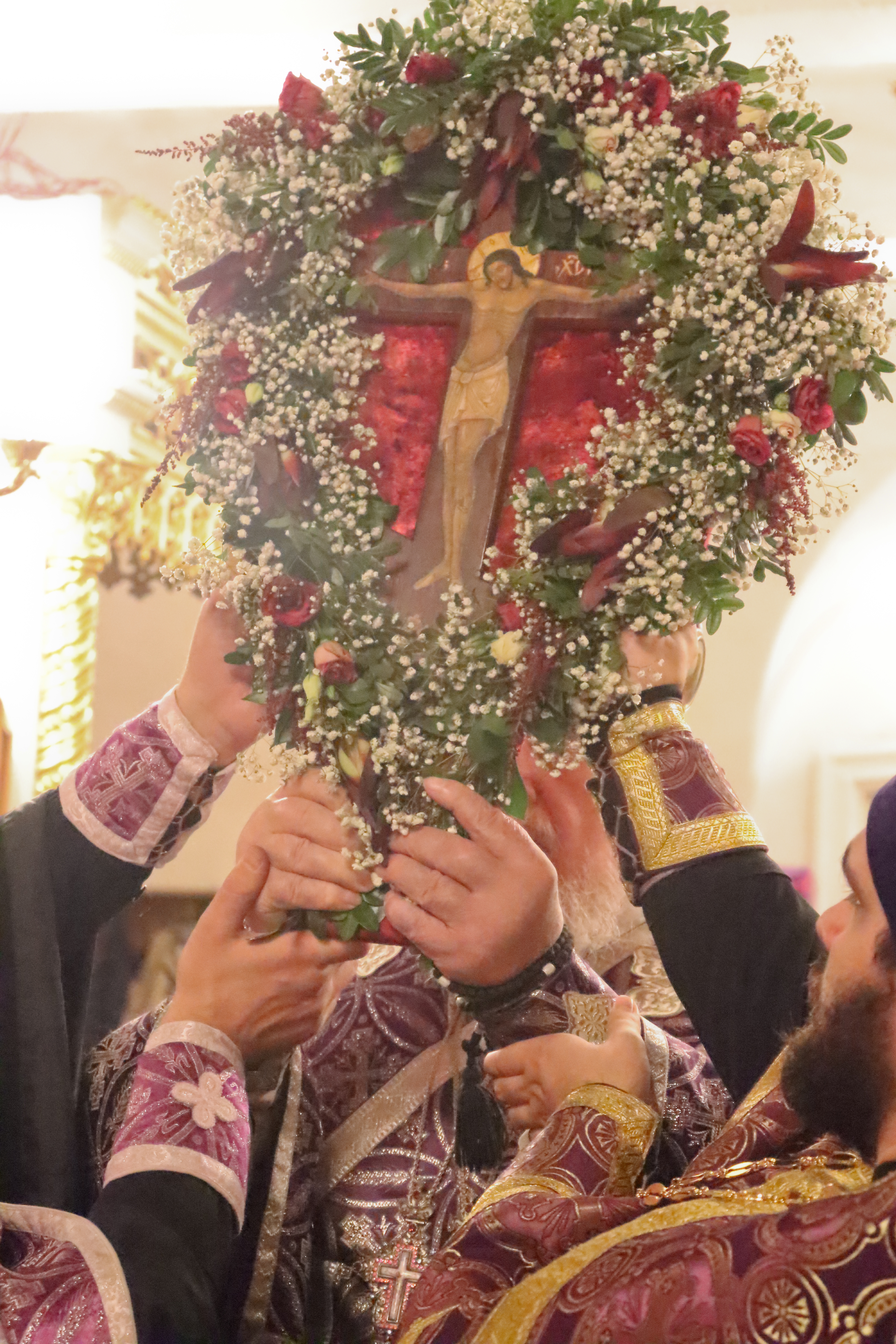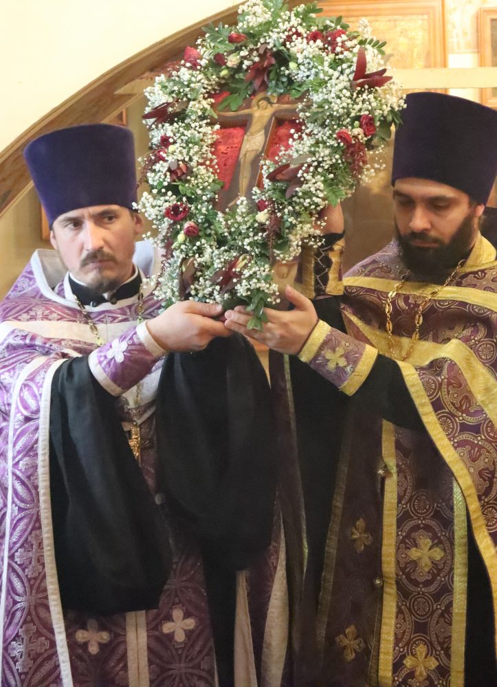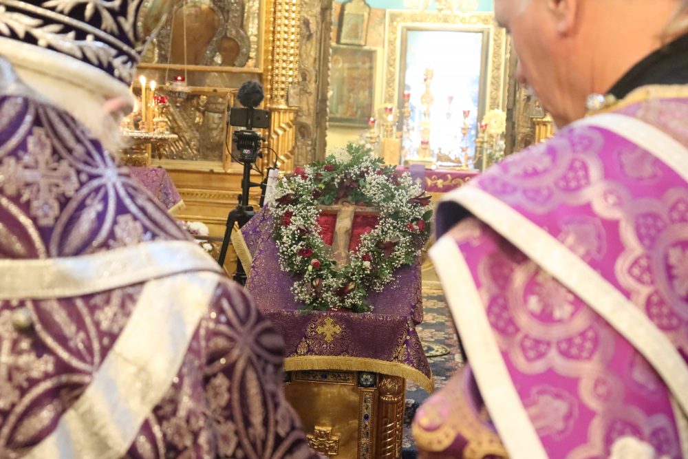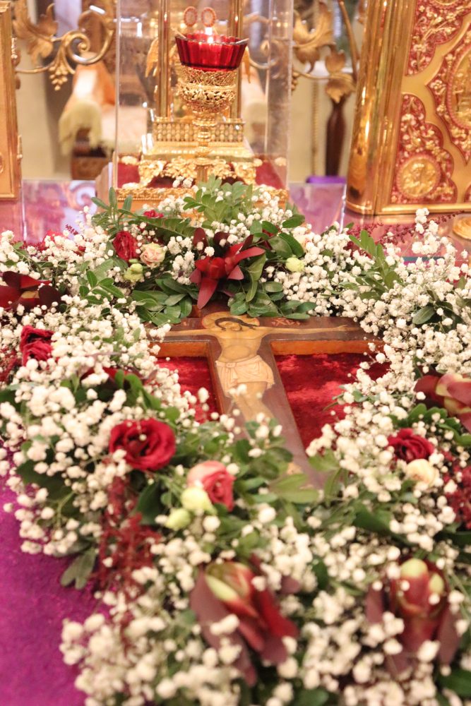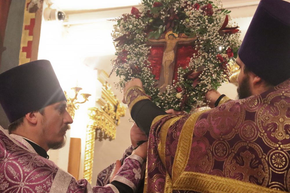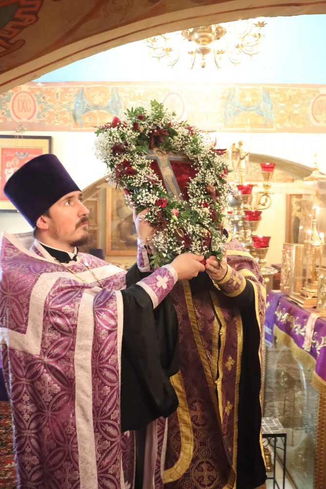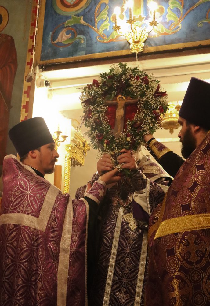 После великого славословия владыка совершил чин Воздвижения Креста.